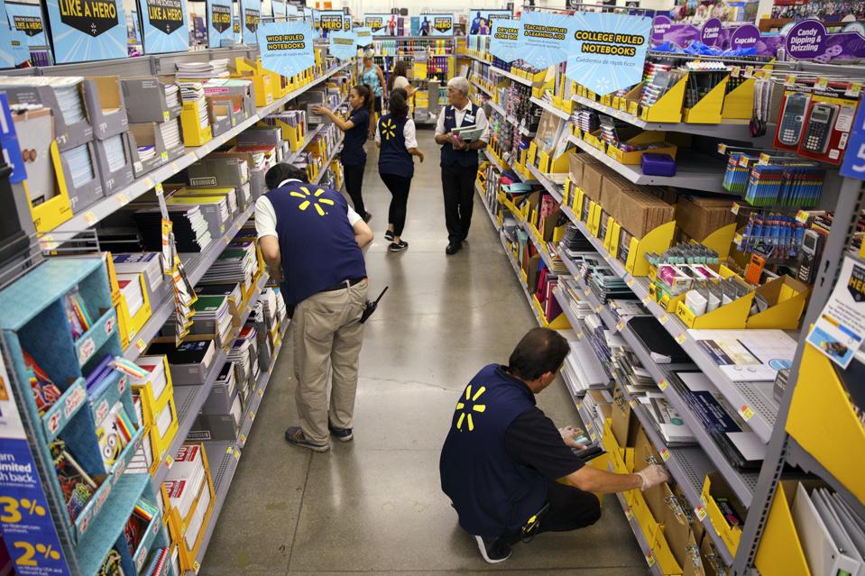Employees restock shelves of school supplies at a Wal-Mart Stores Inc. location in Burbank, California, U.S., on Tuesday, Aug. 8, 2017. Wal-Mart Stores is scheduled to release earnings figures on August 17. Photographer: Patrick T. Fallon/Bloomberg