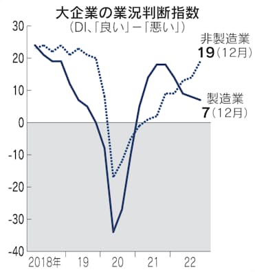 業況判断DIは景況感が「良い」と答えた企業の割合から「悪い」の割合を引いた値だ。12月調査の回答期間は11月10日~12月13日。回答基準日の11月28日までに企業の7割台半ばが答えた。