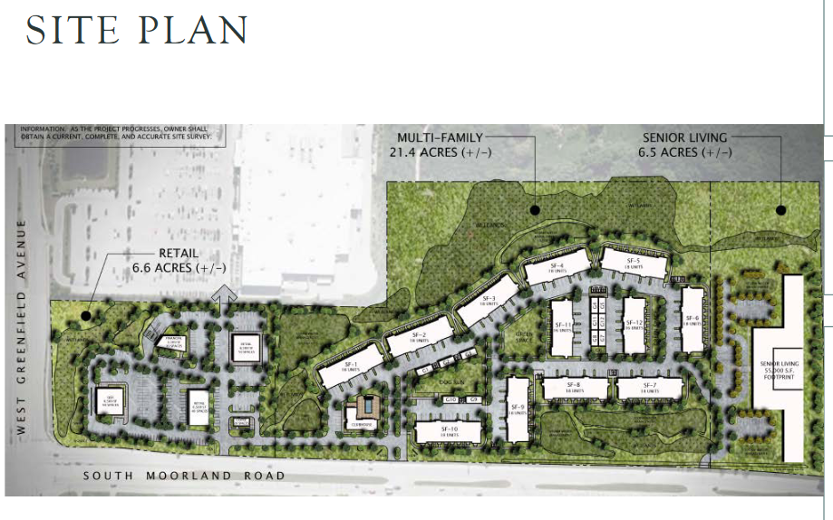Mandel Group envisions a small retail shopping center on 6.6 acres, a multifamily apartment complex on 21.4 acres and a senior housing building on 6.5 acres, all along the east side of Moorland Road south of Greenfield Avenue, in the same busy quadrant that includes the city's largest retail store.